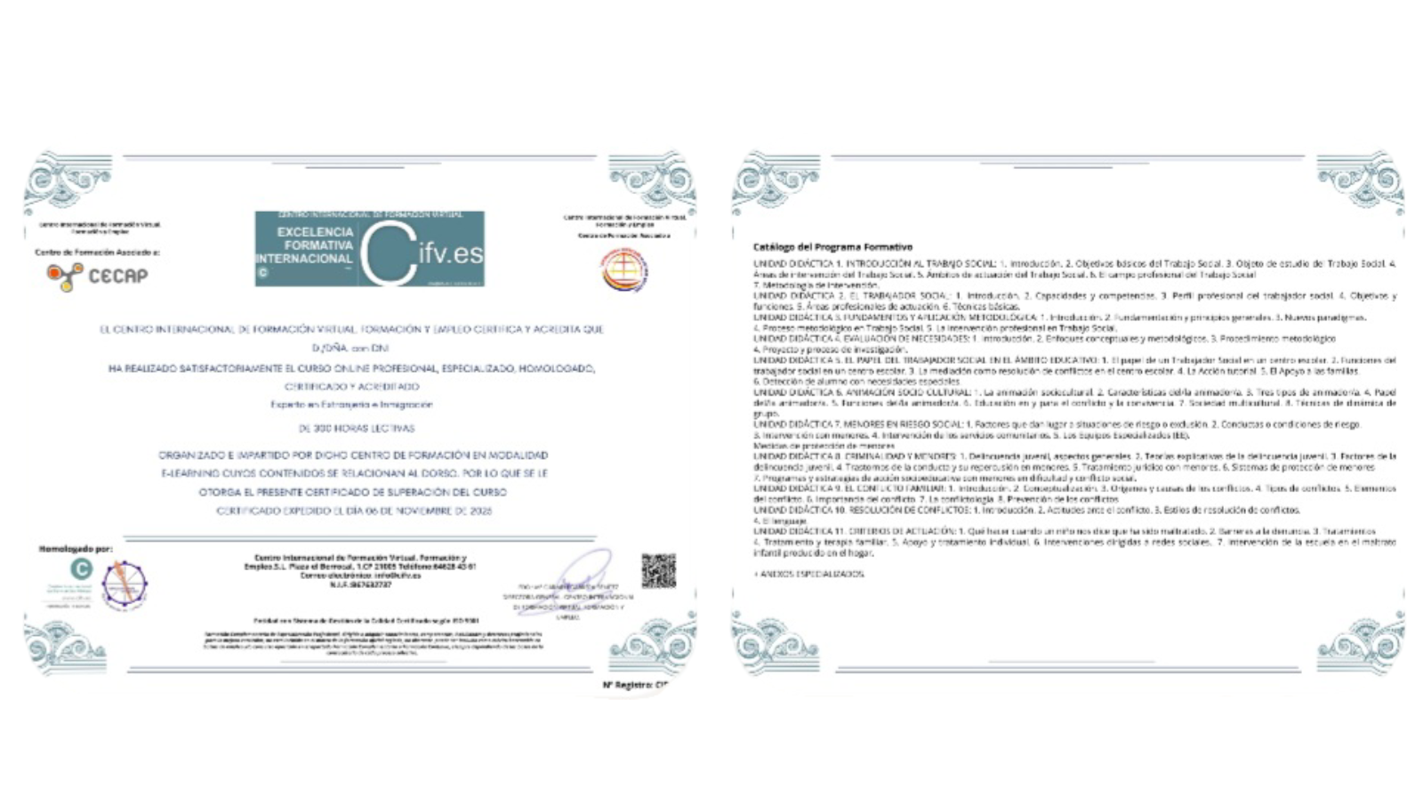 El alumnado que supere el curso recibirá el correspondiente Título del Curso Online Profesional, Especializado, Homologado, Certificado y Acreditado: Experto en Intervención con Mujeres Víctimas de Violencia de Género de 180 horas lectivas emitido por CIFV. Homologado, Certificado, Acreditado y Auditado por CIFV.-Centro Internacional de Formación Virtual. Formación y Empleo. y Homologado por el Colegio Oficial de Ciencias Políticas y Sociología de Castilla y León. Además, CIFV es Centro de Formación Asociado a CECAP, todo ello garantiza que el presente Curso de Especialización Profesional cumple con los más altos estándares de calidad y relevancia profesional, curso válido para sumar méritos tanto en el sector público como privado.